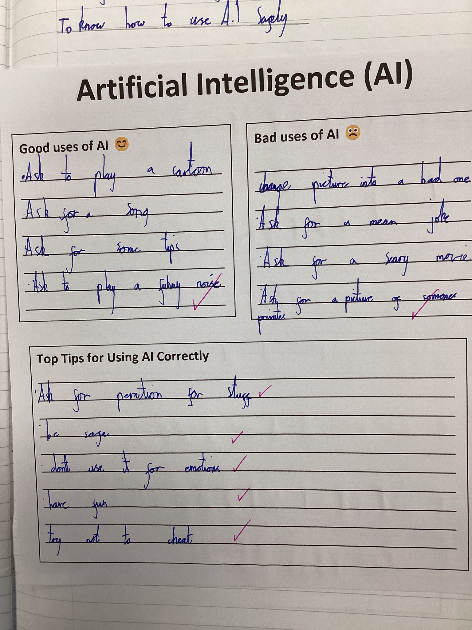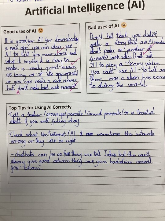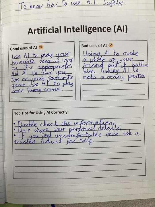 As part of our Safer Internet Day learning, today Year 4 were learning about positive and negative uses of A.I. and they suggested some tips for using A.I. safely. All children understood the importance of not sharing personal details online and telling a trusted adult if anything online, including when using A.I., makes them feel uncomfortable.