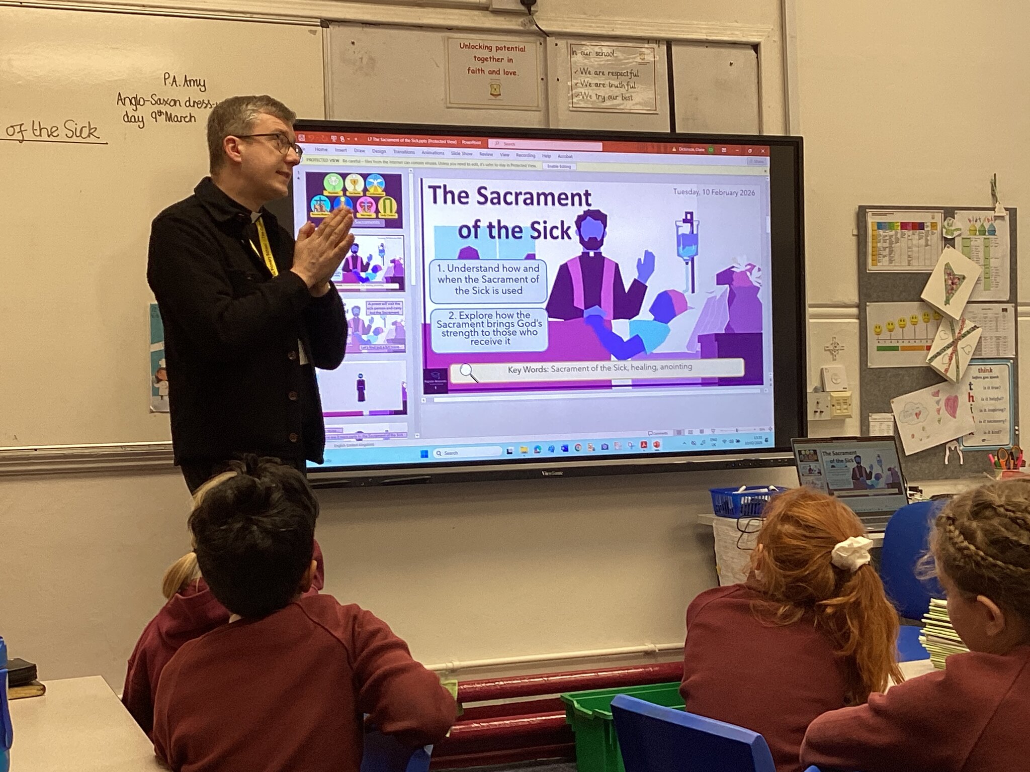 Today, Father John visited Year 4 to talk about the Sacrament of the Sick, to support our learning in R.E.. Father John showed us the oil he uses and talked through what happens when he gives the Sacrament of the Sick to someone. This is a sacrament of healing and brings spiritual healing and strength to a person who is suffering.